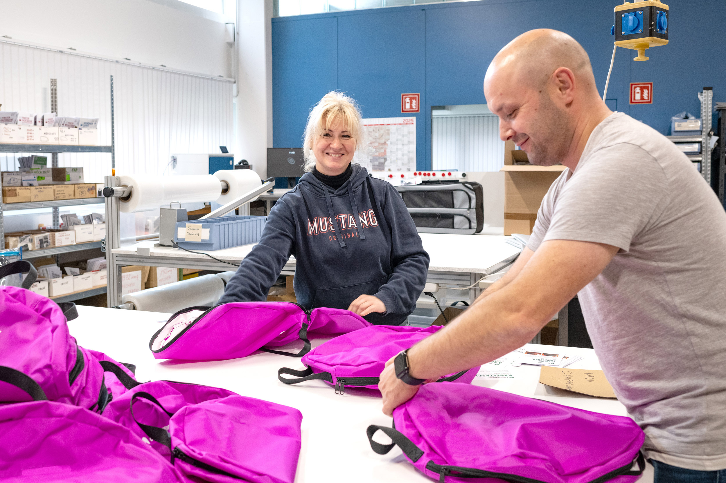 Von Zuschnitt, der Näherei und Konfektionierung bis zur Bedruckung Ihrer Produkte garantieren wir, dass alle Arbeiten bei uns hier im Haus und durch unser bestens geschultes und hochmotiviertes Team ausgeführt werden. Auch lagern wir alle Produkte und senden diese mit einem leistungsfähigen Versandmanagement bei Bestellung durch Wiederverkäufer, Endkunden oder auf Terminierung zuverlässig aus. Dafür stehen wir seit dem Jahr 2004 und deklarieren alle Aufträge, die unser Haus verlassen, voller Stolz zu 100 Prozent als